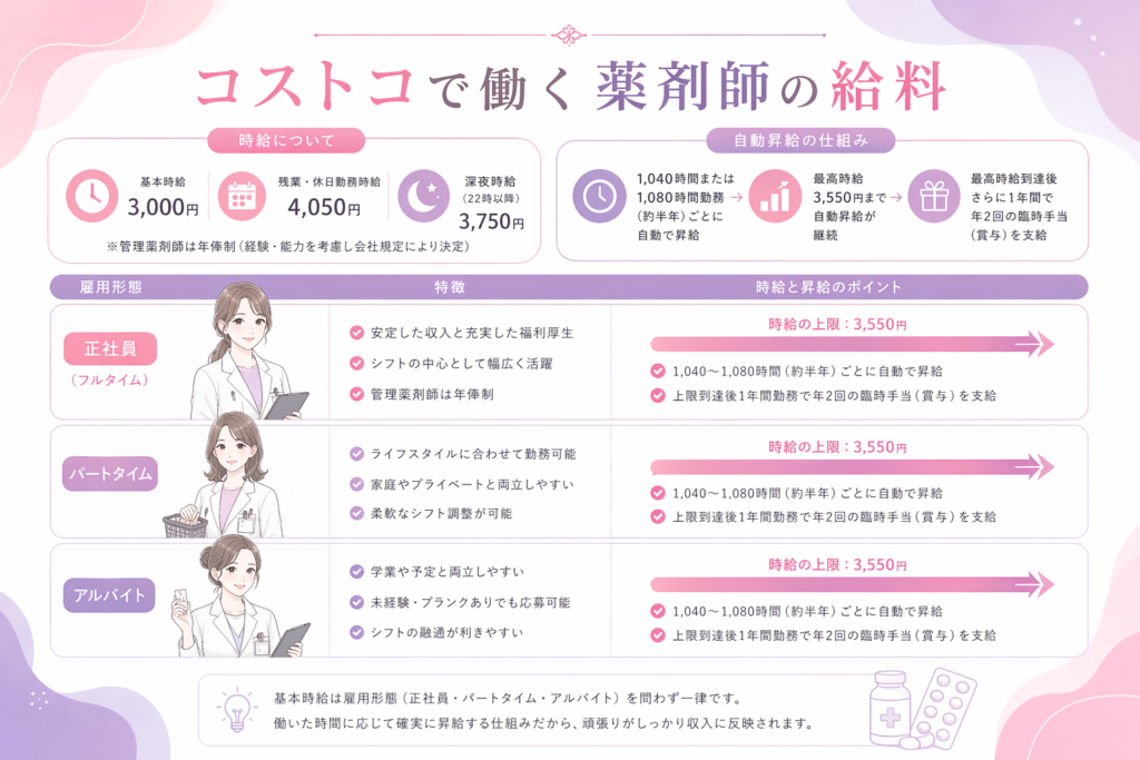 調剤薬局は「ボーナスで補う」給与体系なのに対し、コストコは時給自体が高いためボーナス依存度が低いのが大きな違いです。