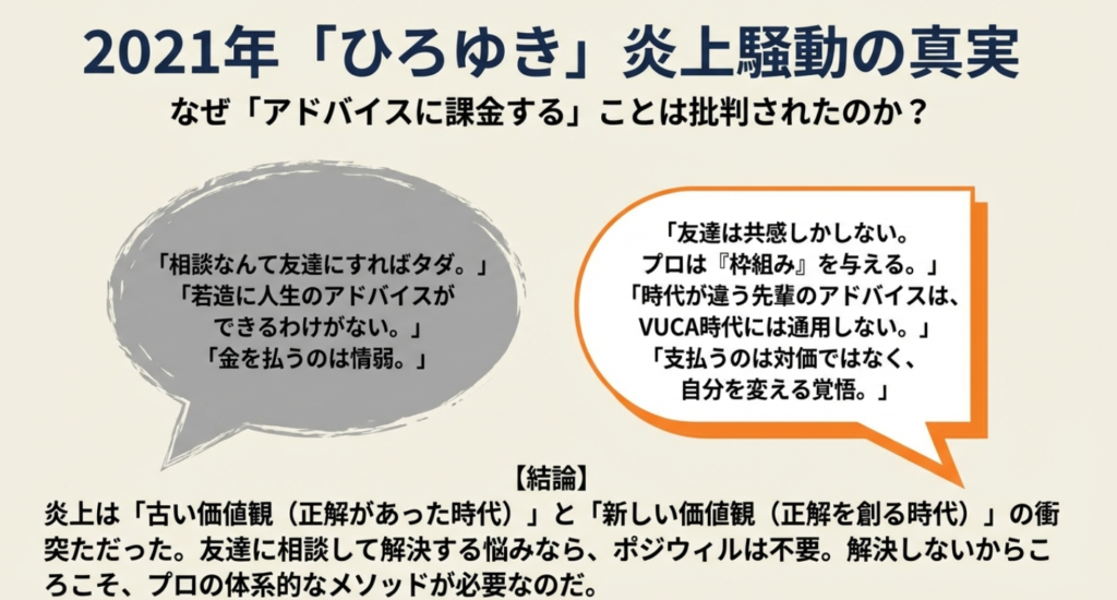 ひろゆき氏は「キャリア相談に高額な費用を払う必要はない」と批判し、ポジウィル側は「利害関係のない第三者だからこそできる支援がある」と反論