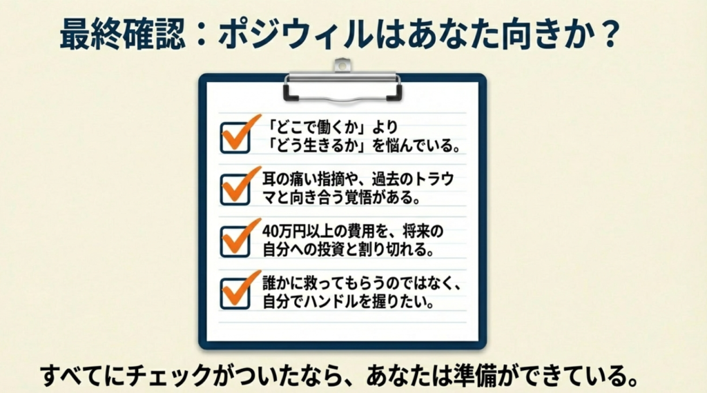 ポジウィルの無料カウンセリングは、単なる説明会ではありません。「このトレーナーに自分のキャリアを任せられるか」を見極める場です。契約を前提にするのではなく、あなたがサービスを審査する意識で臨みましょう。