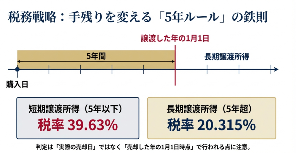 売却益にかかる税率は、所有5年以下か超かで大きく変わります。5年以下は約39%、5年超は約20%と、ほぼ半分になります。ここで重要なのは「5年ちょうど」ではなく、「売却年の1月1日時点で5年超」であることです。