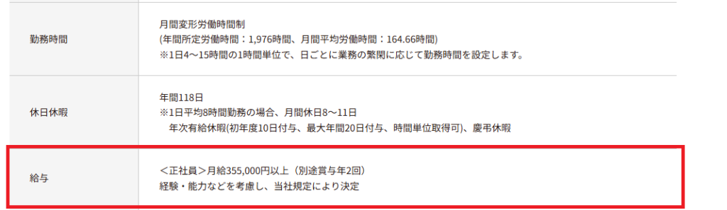 さらに、年2回(7月・12月)の賞与が別途支給されるため、実際の年収はこれを上回るケースが一般的です。経験や配属条件によっては、初年度から500万円以上を目指せる可能性もあります。