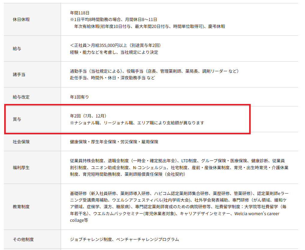 出典:キャリア採用募集要項 薬剤師|ウエルシア薬局 新卒採用サイト
