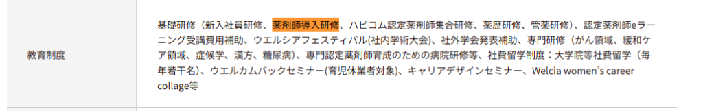 あわせて、薬歴研修・管薬研修・認定薬剤師eラーニング補助・専門研修(がん、糖尿病、漢方など)も案内されており、中途入社者でもスキルアップしやすい体制が整っています。