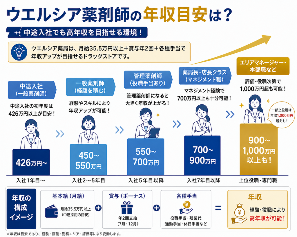 ウエルシア薬局の中途採用(キャリア採用)では、正社員薬剤師の給与は月給35万5,000円以上とされています。単純計算で月給を12か月分にすると、年収は約426万円です。